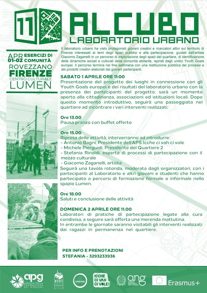 Il Laboratorio Urbano parte del progetto 11ALCUBO di natura pratica si è svolto in due settimane ed è stato condotto dall’ Artista Giacomo Zaganelli. I partecipanti hanno avuto l’occasione per approfondire ed investigare il potenziale offerto, oggi, dalla figura dell’artista che opera nei confronti della collettività e sul senso di utilità sociale del suo lavoro.
