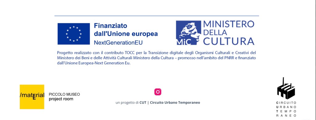 Project Room MATERIALE incarna in forma fisica le attività del gruppo indipendente CUT | Circuito Urbano Temporaneo che da anni indaga i luoghi attraverso i nuovi linguaggi espressivi e i mezzi culturali, co-progettando le azioni e i percorsi con le comunità abitanti e gli artisti chiamati in residenza creativa, utilizzando il processo artistico come motore di consapevolezza, rigenerazione, partecipazione, innescando processi finalizzati a promuovere una crescita della qualità della vita attraverso la creatività contemporanea.